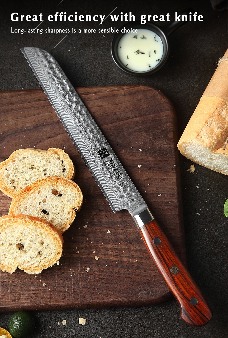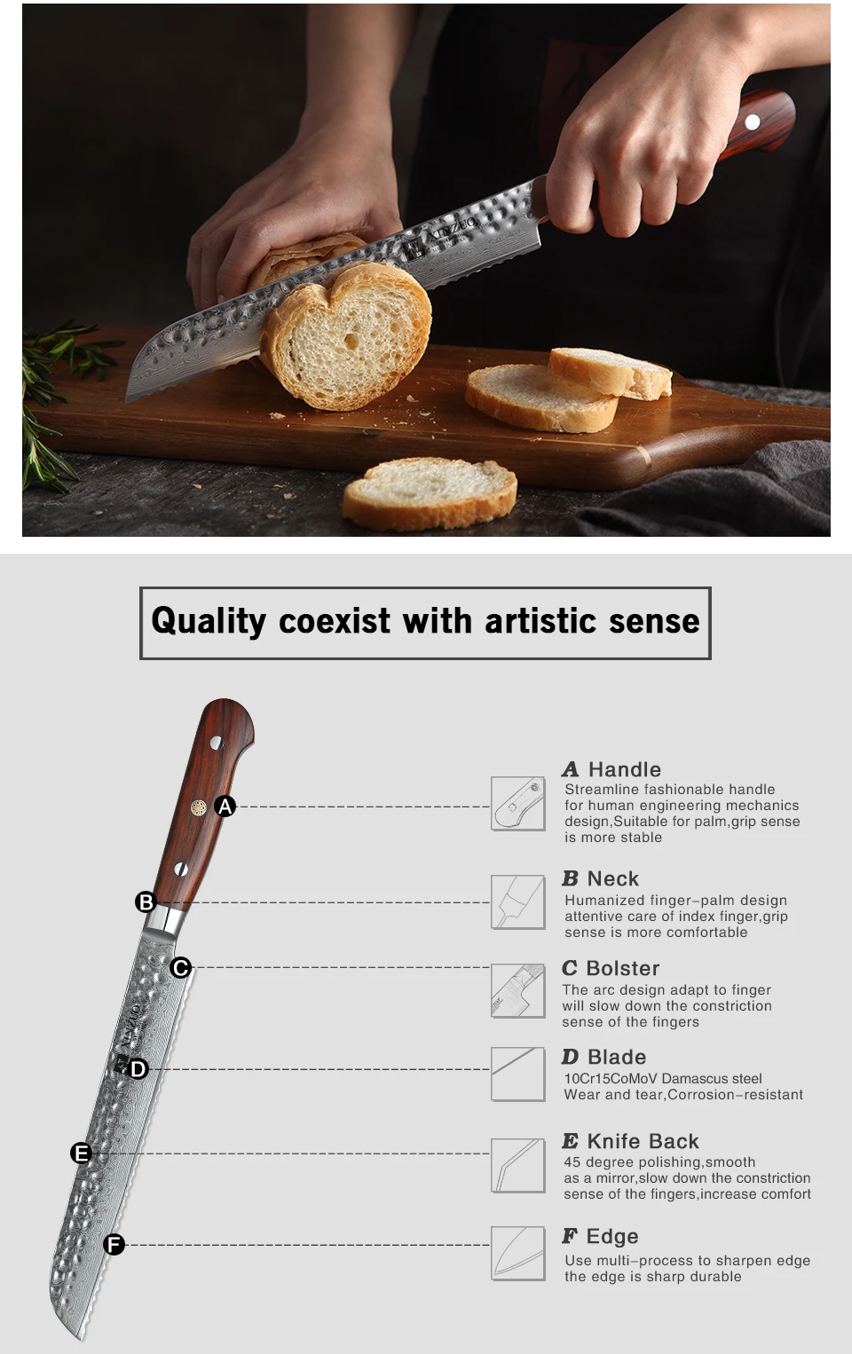 Desde baguettes crujientes hasta panes caseros densos, el DamascoEdge 8" garantiza rebanadas limpias, uniformes y elegantes sin aplicar fuerza, elevando tu experiencia culinaria a nivel profesional.