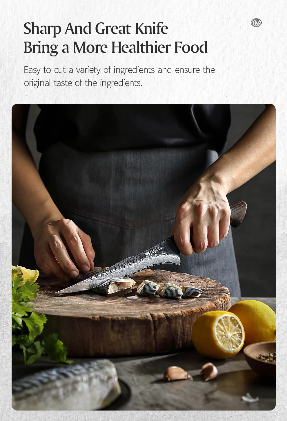 Gracias a su filo afilado a más de 60° y a su estructura de acero Damasco multilaminado, el DamascoEdge 7.5" permite cortes suaves, controlados y sin esfuerzo. Desde carnes hasta pescados y verduras delicadas, cada ingrediente se desliza bajo la hoja con una facilidad impecable.
