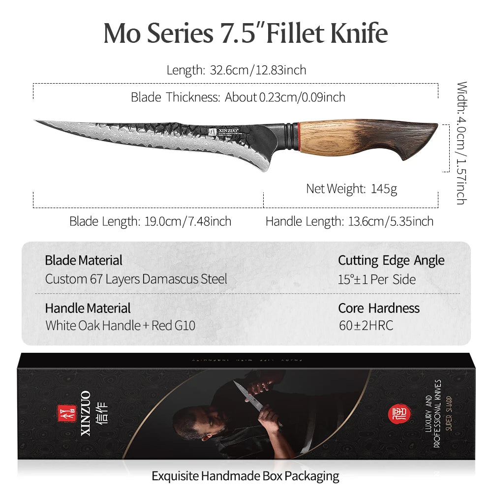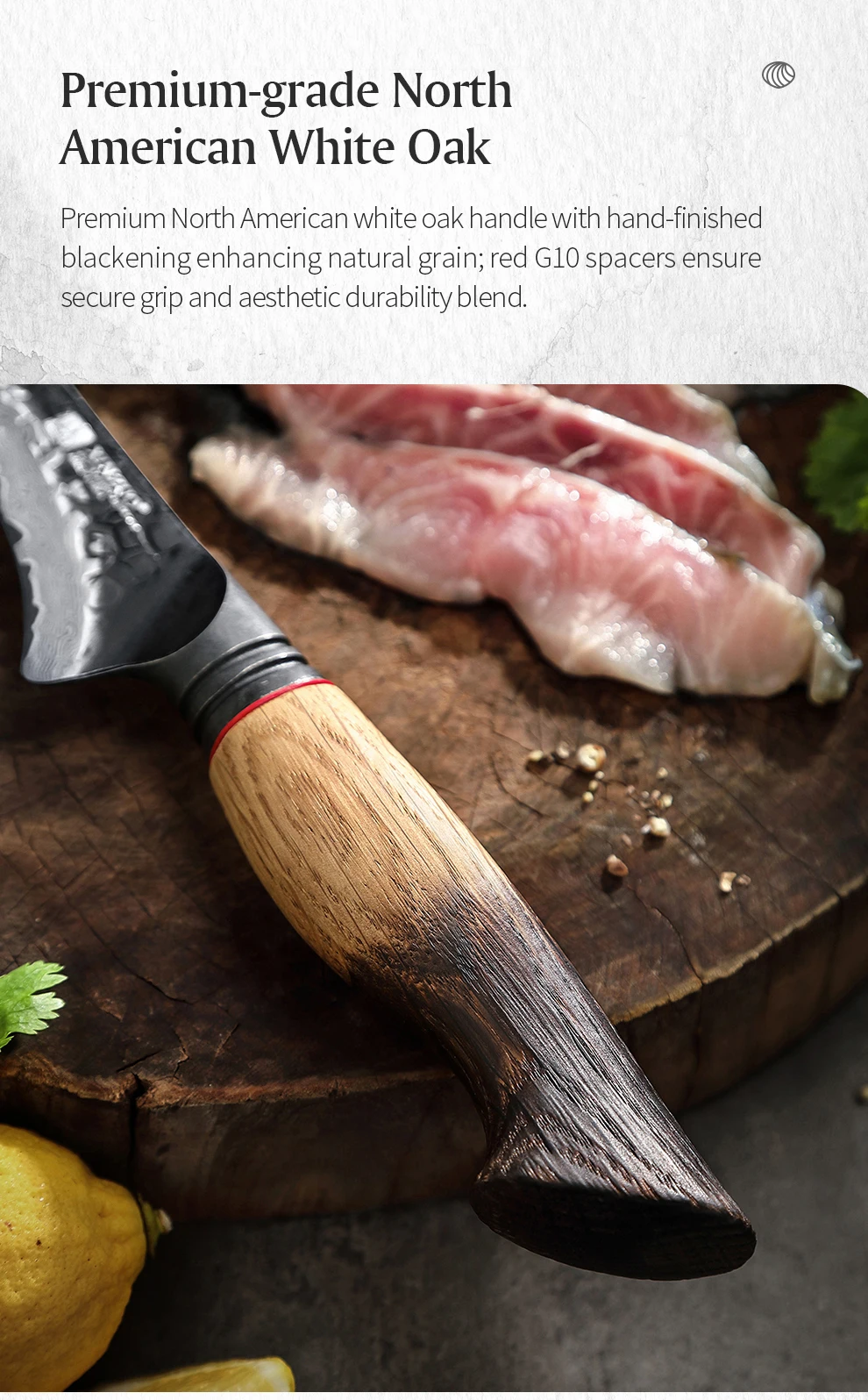 Su superficie pulida revela el distintivo patrón del acero Damasco, un sello de calidad premium que convierte a cada cuchillo en una pieza única. El mango de roble blanco con acabado Red G10 ofrece un balance perfecto entre estilo y ergonomía, brindando confort incluso en sesiones prolongadas de cocina.