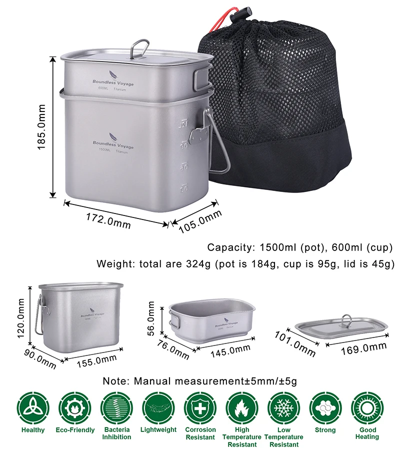 El TitanForge lleva tu experiencia de campamento a un nivel superior gracias a su construcción en titanio 99.8% puro, un material extremadamente ligero, resistente y totalmente seguro para cocinar. Con su olla de 1500ml, taza de 600ml, tapa universal y asas plegables, tendrás un set completo, compacto y listo para cualquier aventura.